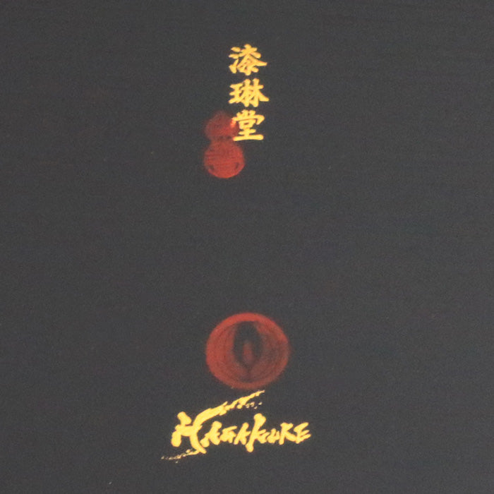 HAGAKUREのブランドカラーであるフォレストグリーンを採用。どんな料理も引き立ててくれる渋いグリーンが特徴です。底の裏面には、漆琳堂さんと弊社それぞれのロゴと社紋が入っています。