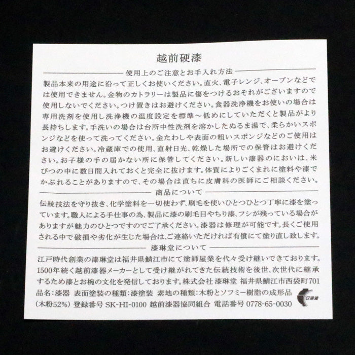 福井大学との共同研究により生まれた越前硬漆。漆器でありながら食洗機対応で、化学塗料を使わず、100%天然漆を使用しています。