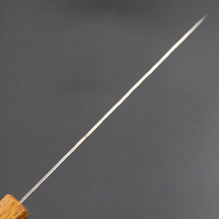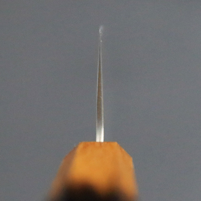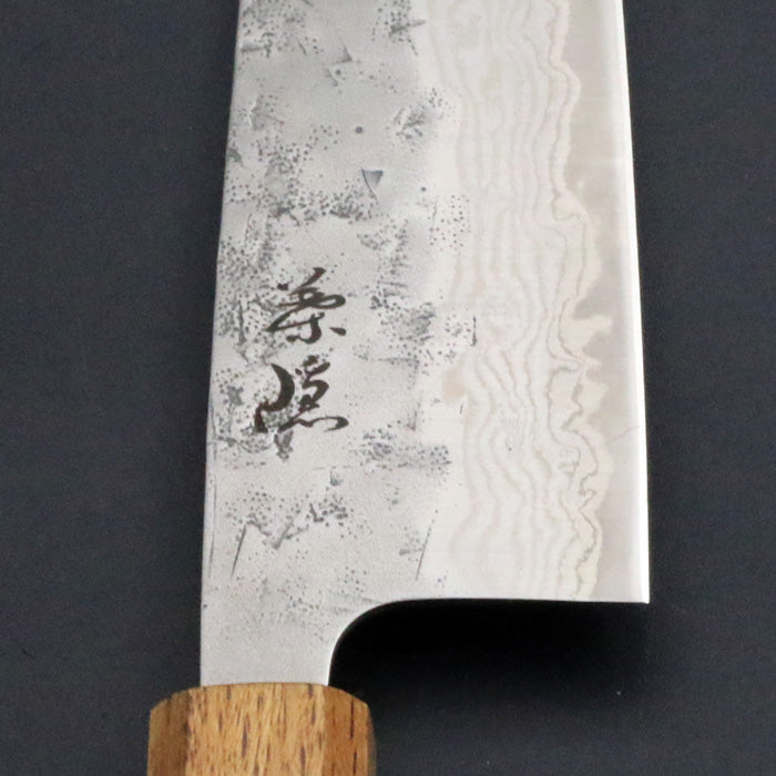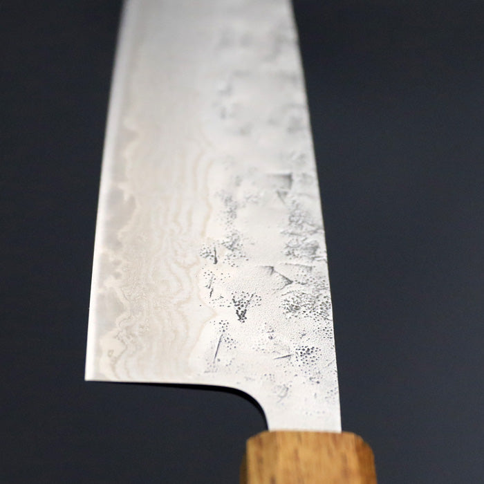 ※レーザー刻印銘「葉隠」シリーズの三徳包丁。ブレードには和紙地(峰側)とダマスカス(刃側)仕上げが施されているバージョンです。同シリーズには緑漆柄、ケヤキ柄と拭き漆柄もあります。