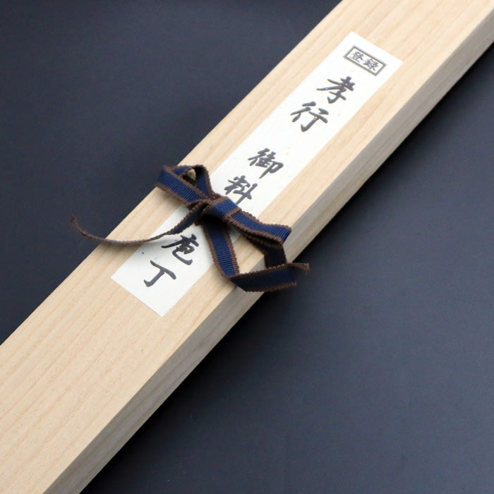 ※世界的に知られる「堺孝行」ブランド。そのなかでも人気を誇る「紫電」シリーズの先丸タコ引き(柳刃)包丁です。